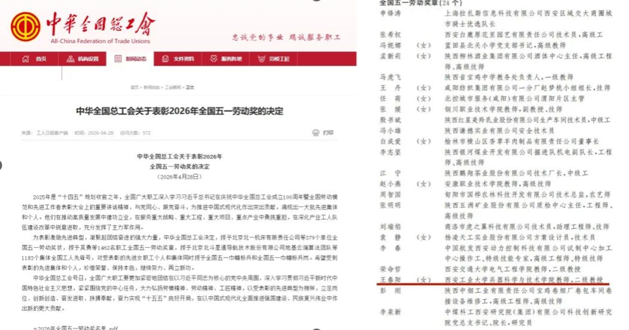 二级教授、西安市重点实验室主任王春阳荣获全国五一劳动奖章(全国五一巾帼标兵)。